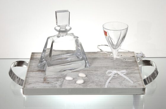 Το σετ περιλαμβάνει το δίσκος επάργυρος με ξυλινη επιφάνεια (4030 wl ) , καράφα κρυστάλλινη ( LA 900 ) και κρυστάλλινο ποτήρι ( FUS 703 )