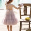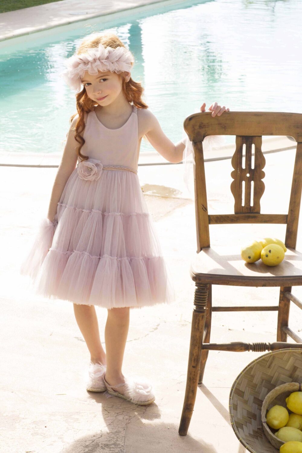 Εντυπωσιακό φόρεμα Baby Bloom ,υψηλής ραπτικής που το χαρακτηρίζει η ιδιαίτερη πλάτη Χ από χειροποίητες πλεξίδες που εφαρμόζει τέλεια στο παιδάκι, μπούστο από glitter τούλι , και πλούσια φούστα με βολάν με εσωτερική επένδυση από μαλακό βαμβακερό ύφασμα .Τη μέση του φορέματος στολίζει χειροποίητη πλεξίδα με εντυπωσιακό λουλούδι στο πλάι όπως και στην πλάτη του φορέματος.