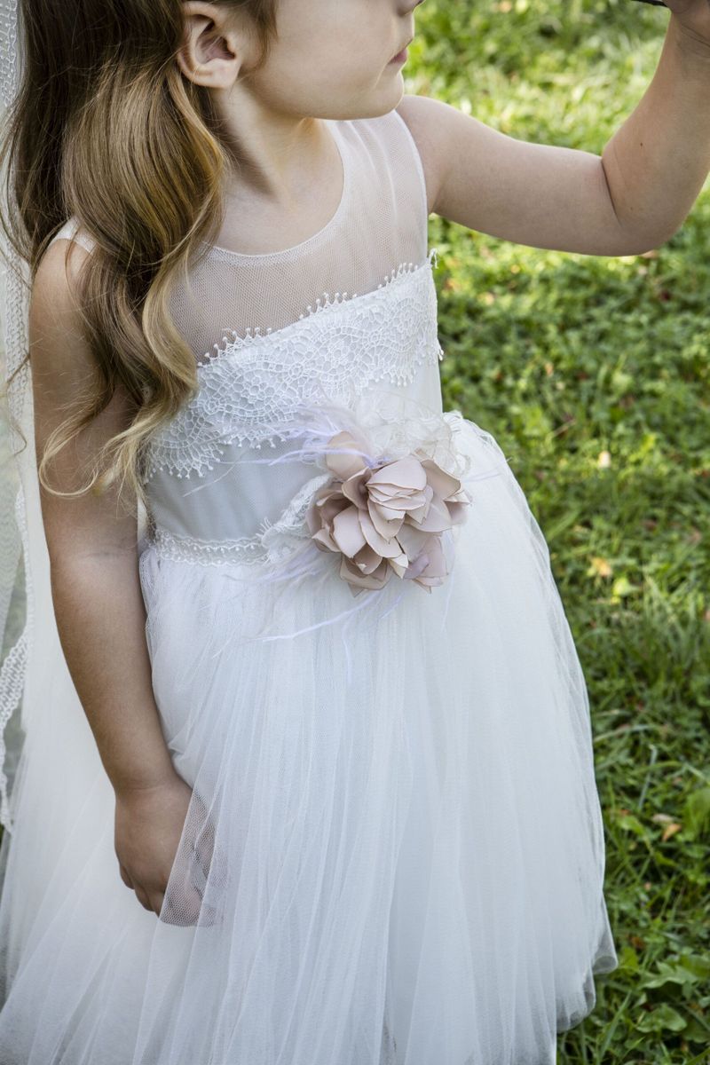 Ρομαντικό τούλινο φόρεμα Baby Bloom της συλλογής Printemps 2023 σε ιβουάρ απόχρωση που το χαρακτηρίζει μια ανάγλυφη βαμβακερή δανδέλα στο μπούστο και στη πλάτη του φορέματος σχηματίζοντας V . Αέρινη φούστα με τελείωμα απο την ίδια δανδέλα . Η εσωτερική επένδυση του φορέματος αποτελείται από μαλακό βαμβακερό ύφασμα.
