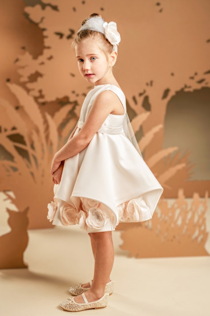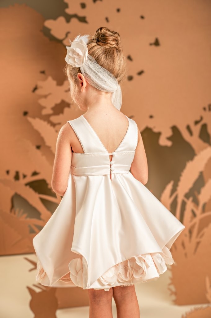 Ένα φόρεμα που συνδυάζει την καθαρότητα της γραμμής με ποιητική ρομαντική διάθεση σε απαλή απόχρωση πούδρας, φτιαγμένο εξολοκλήρου από σατέν ντουσέζ ύφασμα που χαρίζει διακριτική λάμψη. Το μπούστο μπροστά είναι λιτό και αυστηρά καθαρό στις γραμμές ενώ η πλάτη κλέβει διακριτικά την παράσταση με εντυπωσιακές φαρδιές τιράντες, προσθέτοντας σύγχρονη αισθητική στο σχέδιο. Η φούστα ομπρέλα με ασύμμετρες μύτες κινείται με χάρη σε κάθε βήμα, ενώ στο τελείωμά της «ανθίζουν» χειροποίητες υφασμάτινες παιώνιες — μία ρομαντική πινελιά που ισορροπεί ιδανικά με τη λιτότητα του υπόλοιπου σχεδίου. Το σύνολο ολοκληρώνεται με κορδέλα μαλλιών διακοσμημένη με χειροποίητο λουλούδι, δημιουργώντας μια απόλυτα αρμονική εικόνα.