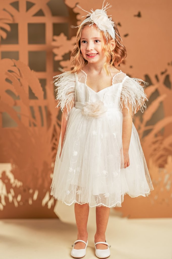 Σε off white χρώμα, αυτό το φόρεμα φτιαγμένο εξολοκλήρου από κεντημένο τούλι, ξεχωρίζει για την ρομαντική αισθητική του. Το μπούστο, σε σχήμα καρδιάς από βαμβακερό ύφασμα ντουμπλάρεται με κεντημένο τούλι που αγκαλιάζει τους ώμους και συνεχίζει στο πίσω μέρος, δημιουργώντας μια εντυπωσιακή διάφανη ανοιχτή πλάτη. Στην θέση των μανικιών, αέρινα φτερά από στρουθοκάμηλο προσθέτουν μια ανάλαφρη, παιχνιδιάρικη αίσθηση. Η φούστα πλούσια, χαρίζει όγκο και κίνηση, ενισχύοντας τη ρομαντική φύση του σχεδίου. Το φόρεμα ολοκληρώνεται με το υπέροχο χειροποίητο λουλούδι σε απαλές αποχρώσεις της πούδρας που στολίζουν το μπούστο αλλά και την τούλινη κορδέλα για τα μαλλιά.