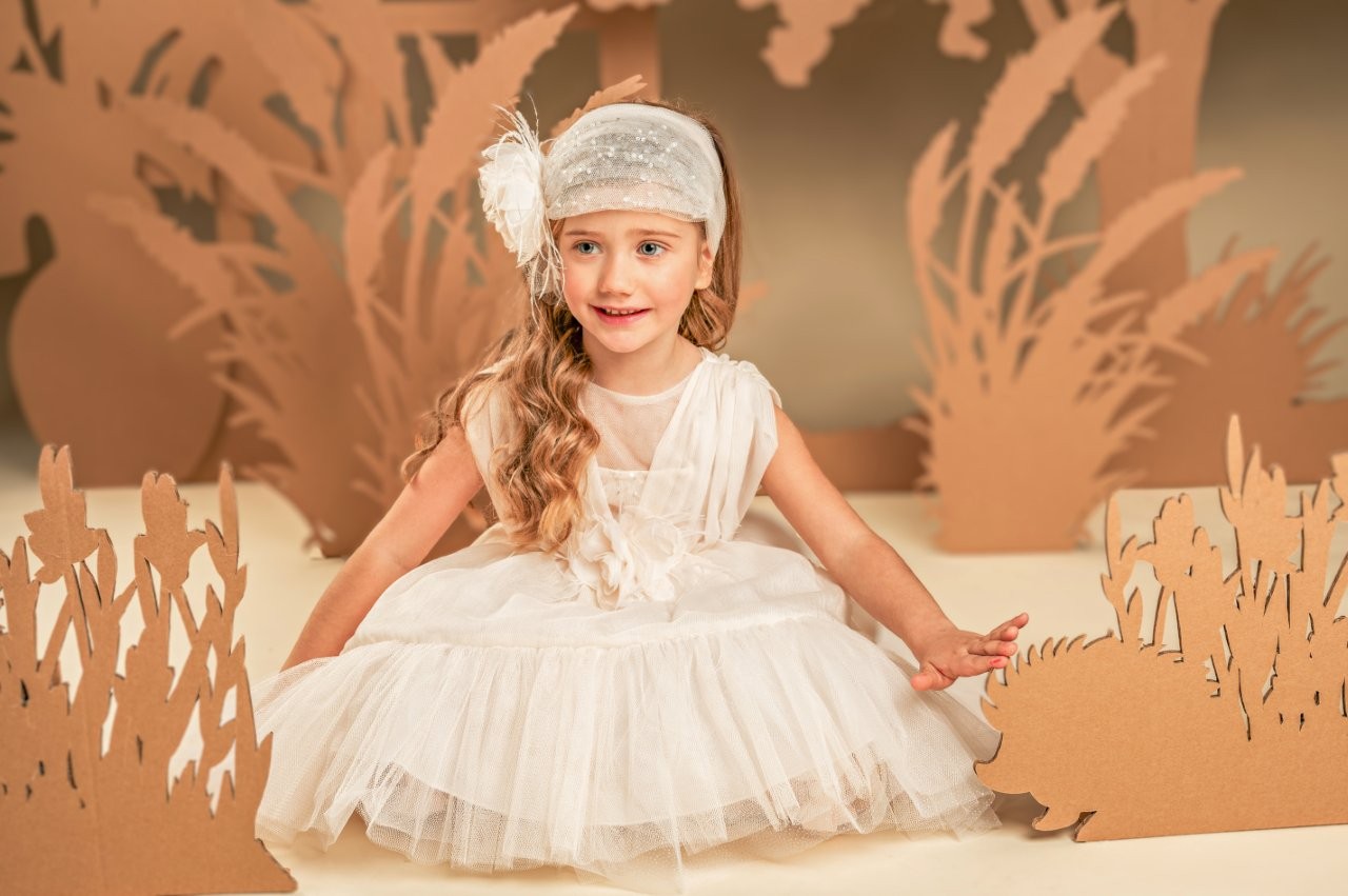 Ένα «ζαχαρωτό» φόρεμα στις αποχρώσεις της πούδρας, φτιαγμένο από γκοφρέ μουσελίνα και μαλακό τούλι. Το μπούστο ντουμπλαρισμένο στο στήθος με ύφασμα από παγιέτες για επιπλέον λάμψη, διαθέτει ντραπαριστές τιράντες από μουσελίνα και ανοιχτή πλάτη. Η πλούσια φούστα με το φαρδύ βολάν στο τελείωμα στολίζεται κομψά με δύο υπέροχα χειροποίητα λουλούδια στους ίδιους χρωματισμούς. Το σύνολο ολοκληρώνεται με μια τούλινη κορδέλα με παγιέτες για τα μαλλιά, διακοσμημένη και αυτή με ένα μεγάλο χειροποίητο λουλούδι.