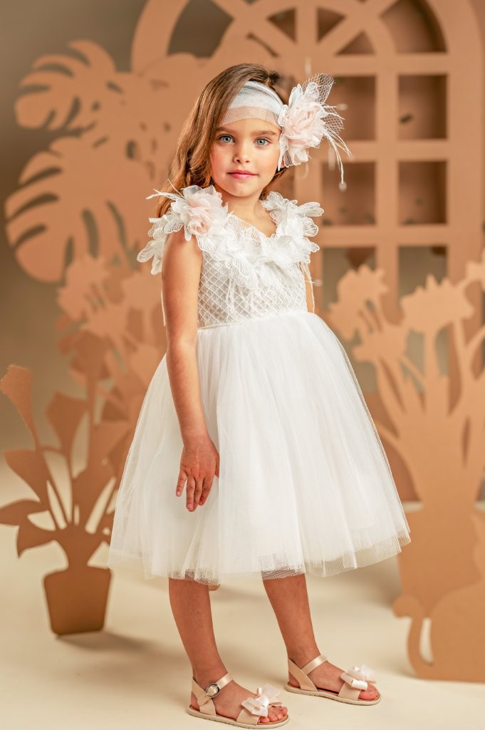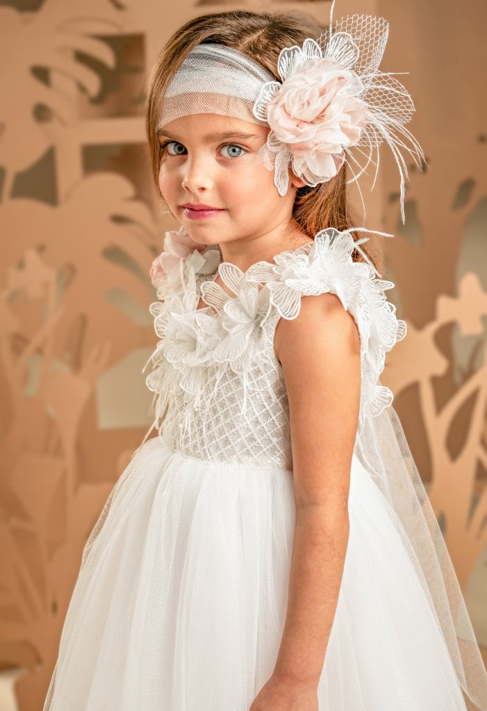 Πανέμορφο φόρεμα σε λευκό χρώμα με έντονα στοιχεία λάμψης και ρομαντισμού. Το μπούστο, φτιαγμένο εξολοκλήρου από ντουμπλαρισμένο ύφασμα με παγιέτες, αναδεικνύεται μέσα από την ανοιχτή λαιμόκοψη και την πλάτη, και οι δύο περίτεχνα στολισμένες με κεντημένα απλικέ λουλούδια σε λευκό χρώμα και χειροποίητα τριαντάφυλλα στο χρώμα της πούδρας. Η φούστα, έχει πλούσια σούρα και πολλαπλά layers από απαλό τούλι με γκλίτερ δίνοντας χάρη και λάμψη σε κάθε κίνηση, Η εμφάνιση ολοκληρώνεται με κορδέλα για τα μαλλιά, διακοσμημένη με τα ίδια τριαντάφυλλά του φορέματος συνθέτοντας ένα ονειρικό σύνολο.