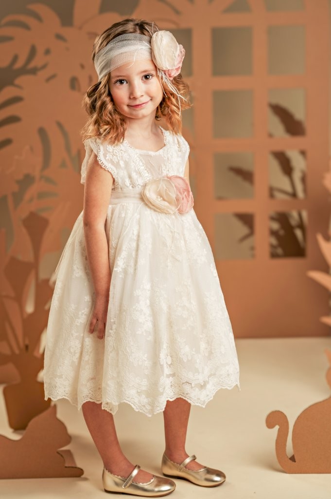 Ένα φόρεμα που αποπνέει νοσταλγική διάθεση, φτιαγμένο εξολοκλήρου από μοναδική δαντέλα σε ιβουάρ απόχρωση. Ξεχωρίζει για τις ντραπέ τιράντες από δαντέλα στο μπούστο, την υπέροχα ανοιχτή πλάτη και την πλούσια, σουρωτή φούστα. Η τούλινη ζώνη στη μέση προσφέρει τέλεια εφαρμογή και στολίζεται με δύο υπέροχα λουλούδια σε παστέλ αποχρώσεις του ροζ και του ιβουάρ. Την εμφάνιση ολοκληρώνει η τούλινη κορδέλα για τα μαλλιά, διακοσμημένη με τα ίδια χειροποίητα λουλούδια του φορέματος.