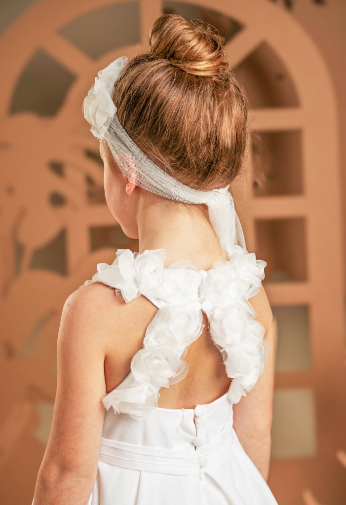 Το φόρεμα ολοκληρώνεται με μια τούλινη κορδέλα μαλλιών διακοσμημένη με τριαντάφυλλα ασορτί με το φόρεμα.