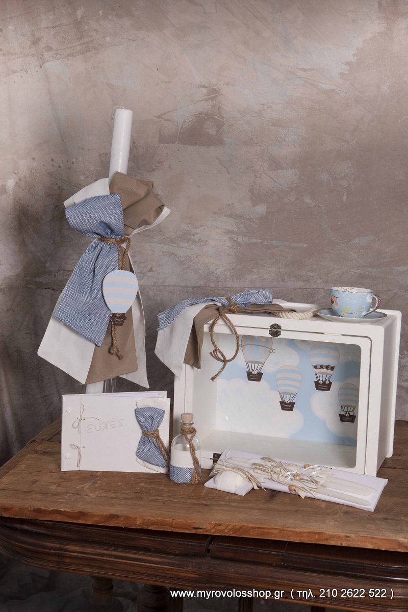 Κ22.50 κουτί ξύλινο με plexy glass καθρέφτη στο μπροστινό μέρος ,ζωγραφική στο χέρι με προτεινόμενο θέμα το αερόστατο και στολισμό στο επάνω μέρος, ασορτί λαμπάδα με τον ίδιο στολισμό, σετ λαδιού (3 κεράκια, μπουκαλάκι λαδιού, σαπουνάκι)και το ευχολόγιο όλα ασορτί με τα υφάσματα των ρούχου.