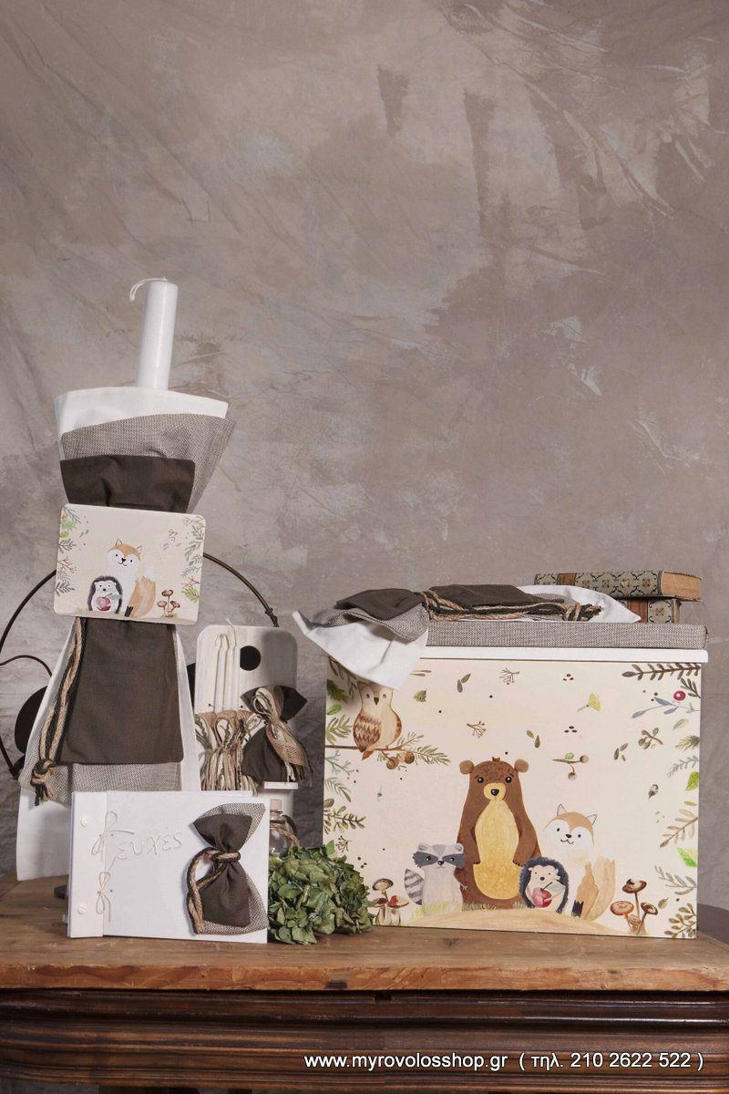 Κ22.55 Πακέτο βάπτισης Baby Bloom σκαμπό ξύλινο με ζωγραφική στο χέρι με θέμα τα ζώα του δάσους , λαμπάδα , σετ λαδιού ( 3 κεράκια , μπουκαλάκι λαδιού και σαπουνάκι ) και το ευχολόγιο , στολισμένα όλα με τα υφάσματα του ρούχου . Μπορεί να γίνει και με θέμα της επιλογής σας .