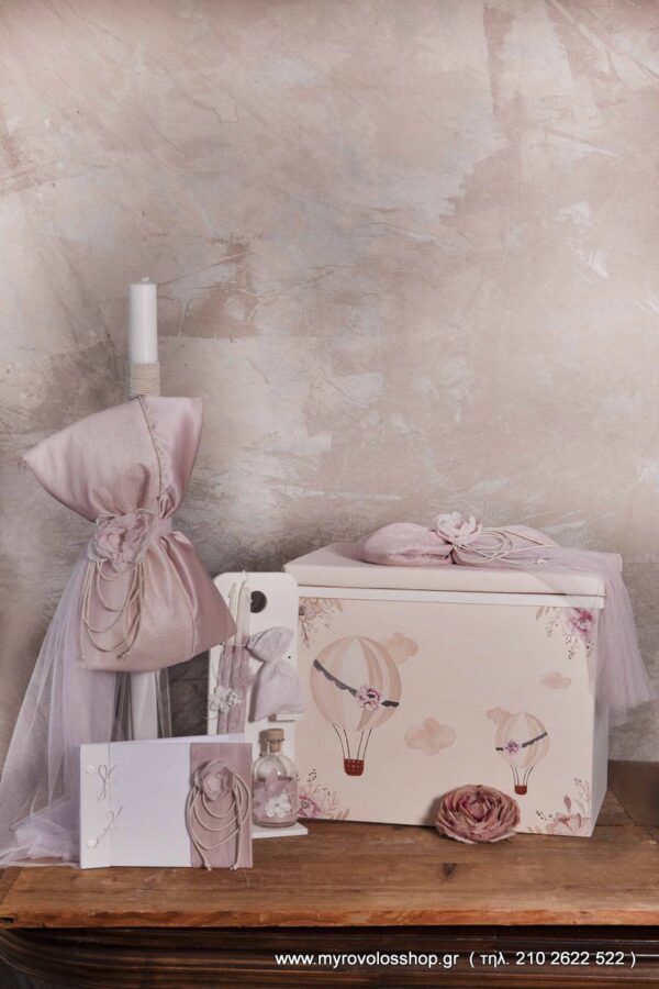 K22.04 Πακέτο βάπτισης Baby Bloom σκαμπό ξύλινο με ζωγραφική στο χέρι με θέμα το αερόστατο , λαμπάδα , σετ λαδιού ( 3 κεράκια , μπουκαλάκι λαδιού και σαπουνάκι ) και το ευχολόγιο , στολισμένα όλα με τις δανδέλες του φορέματος της συλλογής μας nostos collection. Μπορεί να γίνει και με θέμα της επιλογής σας .