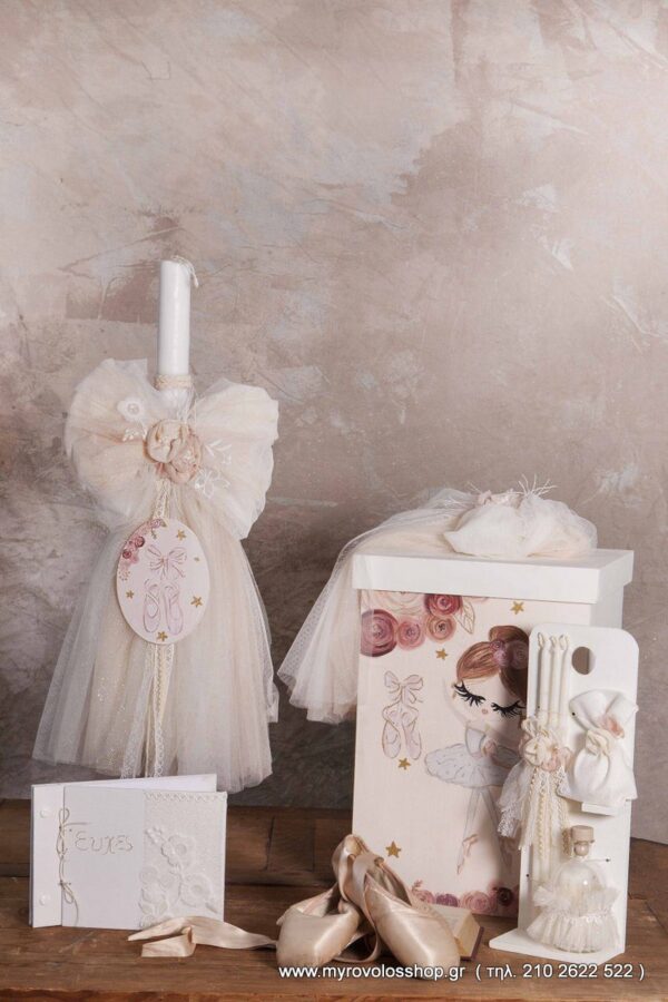 Κ22.10 κουτί ξύλινο στολισμένο στο πάνω μέρος με πλούσια τούλια και χειροποίητη σύνθεση λουλουδιών με ζωγραφική στο χέρι και προτεινόμενο θέμα μπαλαρίνα ,ασορτί λαμπάδα με τον ίδιο στολισμό, σετ λαδιού(3 κεράκια, μπουκαλάκι λαδιού, σαπουνάκι)Και το ευχολόγιο . Kαθε πακέτο βάπτισης μπορεί να στολιστεί με οποιοδήποτε φόρεμα της συλλογής nostos collection.