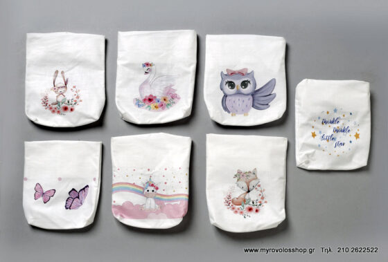 Μπομπονιέρα Βάπτισης Υφασμάτινο Πουγκί με ψηφιακή θεματική εκτύπωση bell-167 Υπάρχει η δυνατότητα αλλαγής του χρώματος και σχεδίου και εκτύπωσης του ονόματος Κατασκευάζονται κατά παραγγελία και απαιτούνται minimoum 15 ημέρες παράδοσης 1. Η τιμή αφορά σκέτο το αντικείμενο (χωρίς δέσιμο – κουφέτα – κορδέλες) και είναι τιμή τεμαχίου 3. minimoum 40 ΤΕΜ.